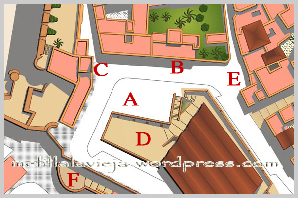 Plano de la zona de la Plaza de Estopiñán (A), donde destacan la Torre del Reloj o de la Vela (C), la Casa del Gobernador (B), la calle San Miguel (E), la Plaza de la Maestranza y Aljibes (D) y el Torreón de la Cal (F)