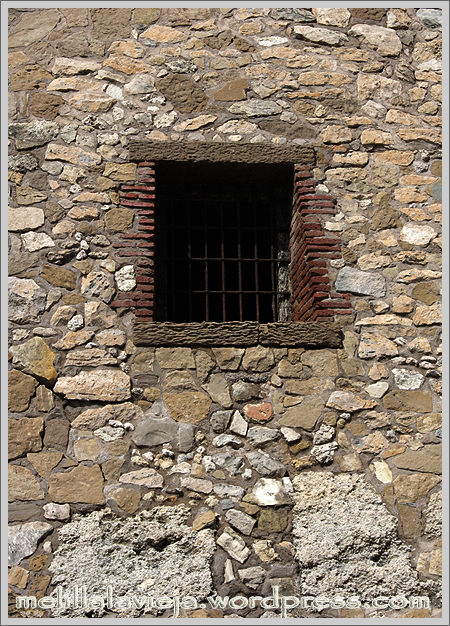 Estructura de las cuevas de Florentina (en blanco). A) Entrada a las cuevas. B) Túneles de la Florentina. C) Torreón de Bernal Francés. D) Aljibe. En la foto de la derecha, Torreón de Bernal Francés y una de las ventanas de las cuevas |