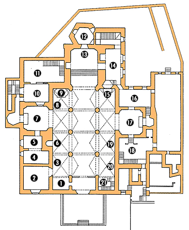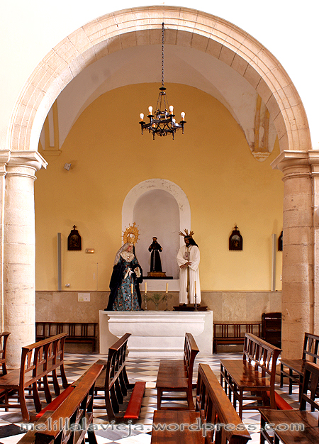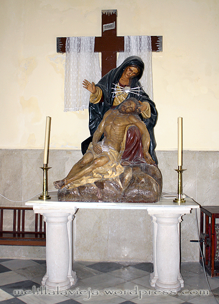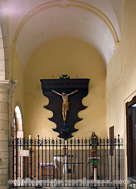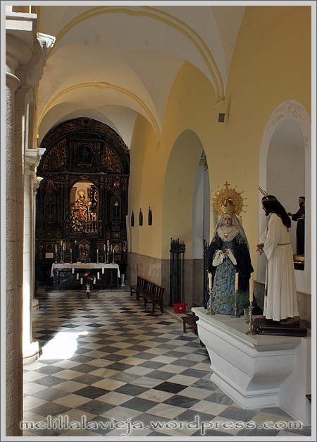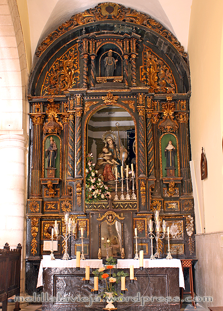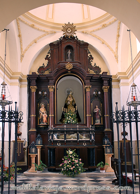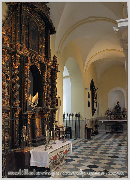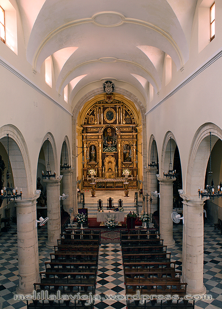 La planta de la iglesia orientada de norte a sur está formada por tres naves, separadas por cinco pilares (de 1,40 metros por 1,00 metro de base) a cada lado de la central, unidos por arcos de medio punto con dovelas que forman arquerías. Éstas soportan el muro de sustentación de una bóveda de cañón con arcos fajonados y lunetas para ventanas que se abren encima de los arcos. La nave central, en su extremo norte, queda rematada por un escudo papal que debería de ser de Alejandro VII, pero en realidad es de uno de los Médicis y con toda probabilidad se trajera de Andalucía colocándose en una de las restauraciones del templo sobre el centro del arco triunfal que da paso al Presbiterio. Y, en el extremo sur, por el vestíbulo de la puerta de entrada con plataforma para un coro sobre ella. A los otros lados de las columnas, y arrancando de los arcos de medio punto, desarrollan cuatro bóvedas de aristas, consecutivas, que crean la cubrición de cada una de las dos naves colaterales simétricas. Estas naves cuyas dimensiones en planta son de 4,60 metros por 24,20 metros, al llegar a su segunda bóveda de arista que se alejan del altar mayor, forman capillas rectangulares, de 5,60 metros por 5,80 metros, cuya abertura es un arco de medio punto en los muros de cerramiento del conjunto. Estas capillas quedan rematadas por cuatro pechinas que soportan cúpula circular con linterna. Al carecer de tambor, abren en las paredes laterales ventanas a la altura de las pechinas y bajo éstas se sitúan puertas que dan acceso a las sacristías. En el muro frontal de las capillas, donde se sitúa un altar, existe un hueco que tras de si alberga un camarín de forma hexagonal por el cual se accede, mediante una escalera que desemboca en la sacristía lateral. En la tercera bóveda de las naves laterales se encuentran hornacinas en el muro de cierre con altar en su base. Conjuntamente a las paredes del vestíbulo quedan situados el Baptisterio y la subida al coro, quedando el primero en la nave lateral oeste y la subida en la del este. El prebisterio presenta la misma distribución en su forma que las demás capillas, salvo que su bóveda es ovalada y no tiene linterna. Su camarín, al igual que los anteriores es hexagonal, diferenciándose en sus mayores dimensiones y en los dos huecos de ventanas practicados en sus caras posteriores que dan al exterior, a los lados posteriores de la imagen de la Virgen de la Victoria patrona de la ciudad, que en este lugar se sitúa. Texto de Jesús Miguel Sáez Cazorla |