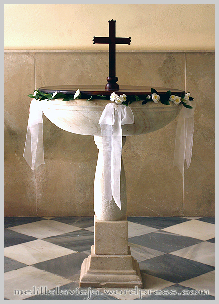 La pila bautismal es una amplia y severa concha de mármol procedente de la antigua iglesia dedicada a San Miguel o, tal vez, de un viejo tempo que se llamó Santa Barnola.